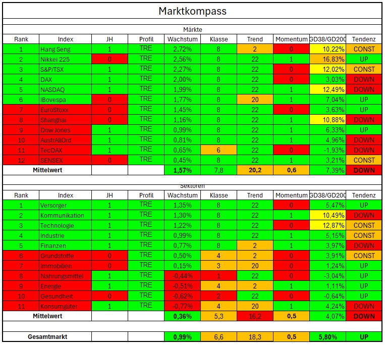 Der Marktkompass zeigt die Outperformer regional verteilt, d.h. es sind sowohl in Asien als auch in den USA und Europa gute Segmente zum Investieren in den Tops. Besonders Hang Seng sowie der Nikkei ragen mit der Entwicklung hervor.