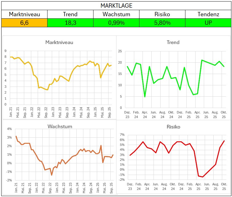Nach dem Markteinbruch im April 2025 hat sich der Markt in den letzten Monaten wieder auf hohem Niveau stabilisiert. Das Marktwachstum mit ca. 1 % hat sich allerdings etwas abgeschwächt. Trotzdem bleibt der Trend seit Monaten sehr stabil aufwärts.