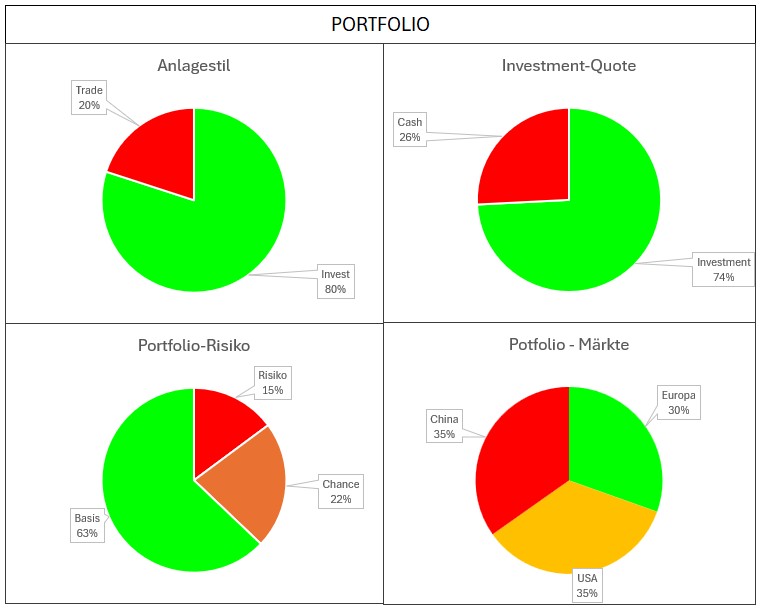 Um die Marktlage zu bestimmen werden das aktuelle Marktniveau, der Trend, das Wachstum und das Risiko analysiert. Auf dieser Grundlage werden die wichtigsten Parameter für die Portfoliostrategie wie die Investitionsquote, der Anlagestil und die Risikostruktur festgelegt. Die Analyse der Zielmärkte ergänzt den Marktcheck mit der inhaltliche Ausrichtung des Portfolios.
