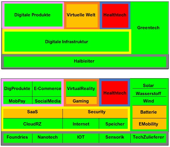 Im Quartalscheck zeigt sich erstmals nach Jahren eine positive Entwicklung im Greentech, wo die Aktien nach jahrelanger Abwärtsbewegung sehr günstig geworden sind und nun eine auffällige Gegenbewegung starten. Im Gegensatz dazu ist besonders Healthtech das negative Pondon. Alle anderen können im Allgemeinen eine positive Entwicklung vorweisen.