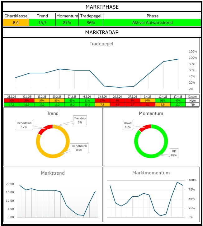 Der Gesamtmarkt erlebt nach der massiven Trendkorrektur im März eine rasante Gegenbewegung, ein Speed Shot, wie ich ihn nenne, bei dem fast alles unterschiedlich stark nach oben schießt und damit auch die Indizes nach oben zieht. Dieser Speed Shot hat nach 3 Wochen Laufzeit sicher die meiste positive Entwicklung hinter sich und dürfte demnächst abebben. Dies zeigt auch der Tradepegel, der am oberen Anschlag ist, sowie das Momentum, was ebenfalls fast auf dem maximalen Stand steht. Der Trendausbruch ist ein gutes Zeichen, der sich daraus evtl. ergebende Trend muss aber noch bestätigt werden.