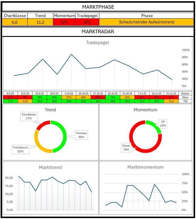 Die Momentumkorrektur im Markt geht nun in die 4. Woche. Die andauernde Schwäche hat nun zur Konsequenz, dass sich der Markttrend abschwächt und nun den niedrigsten Stand seit April 2025 erreicht hat. Die fallenden Werte im Tradepegel und im Momentum deuten auf eine Fortsetzung der Marktkorrektur hin, die zu einer Trendkorrektur führen kann.