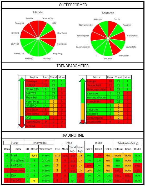 Das Trendbarometer im Marktwatch zeigt sowohl in den Regionen als auch bei den Sektoren die Underperformer führend während die Outperformer etwas hinterher laufen. Die laufende Korrektur macht sich in fast allen Segmenten bemerkbar, aber besonders bei den Outperformern machen sich Trendbrüche bemerkbar.